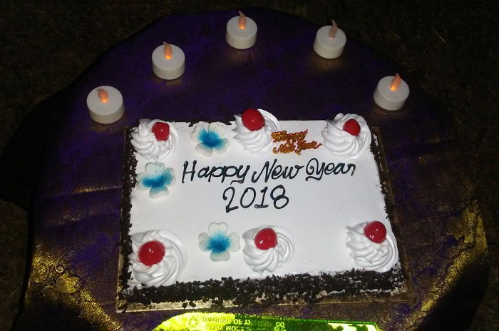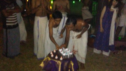We welcome the New Year 2018 celebrating in front of the Koothambalam after the performance. Margi Madhu Chakyar and his son Nepathya Sreehari Chakyar cut the New Year cake.