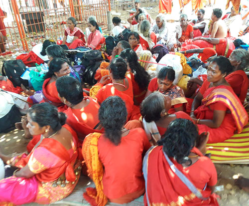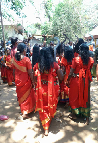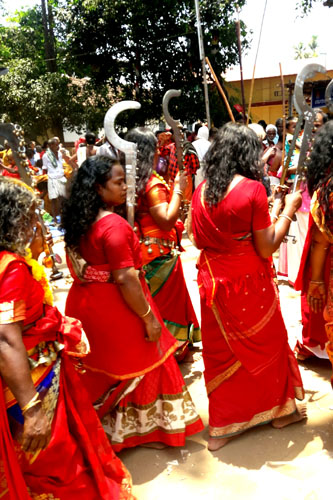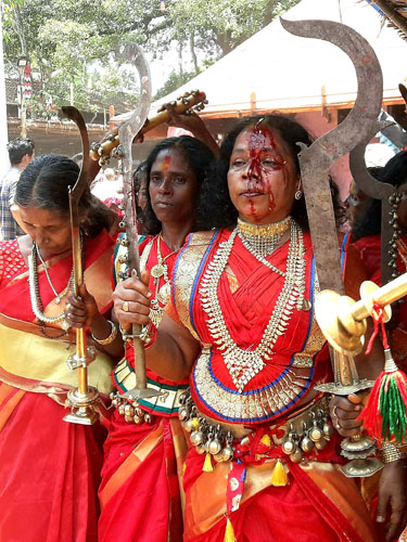 Hanno solo un intento tutti coloro che camminano lungo il viale principale del paese: raggiungere il tempio. Il passo é svelto, sostenuto, a volte ritmato dai canti e dai tamburi. Spesso uomini e donne in piccoli gruppi, vestiti di rosso e con in mano la spada a falce di luna sono giá in una sorta di trance mentre camminano velocissimi per raggiungere il Bhagavathy temple. Non perdono tempo a guardarsi intorno. Filano dritti verso la meta principale. I passanti si spostano altrettanto velocemente per lasciarli passare.
