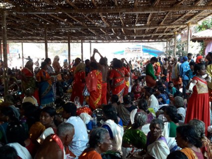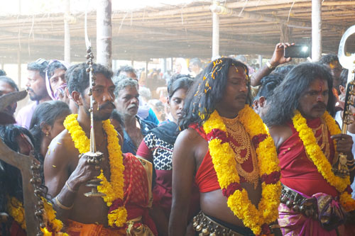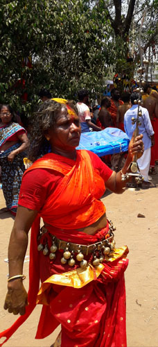 I ritmi dei tamburi, le urla, i canti e il vociare sono assordanti. Il ritmo incalza e una sorta di trance investe tutti noi presenti. Loro, i devoti e le devote, sono armati e al culmine della trance si flagellano il centro della testa fino a quando il sangue non cola sui volti. La curcuma viene copiosamente gettata sulla ferita per disinfettare. Il rosso del sangue e l’arancio della curcuma mischiandosi sulla testa danno un aspetto ancora piú esagitato ai loro volti.