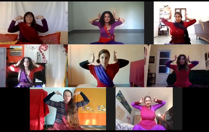 Danzare sul Respiro delle Yogini ci ha unito per cinque intensissimi incontri online nei quali le Hasta Mudra, i gesti delle mani, hanno raccontato versi scrivendoli nello spazio, le movenze del corpo hanno incarnato le Yogini e il nostro spirito si è lasciato cullare dal suono di musiche di varie tradizioni.