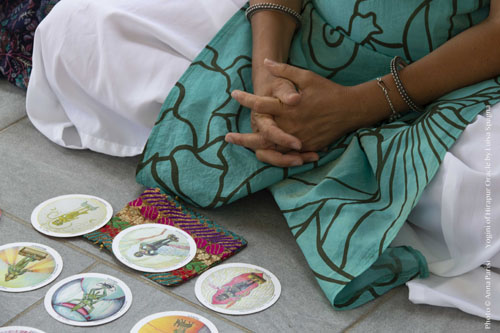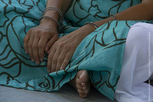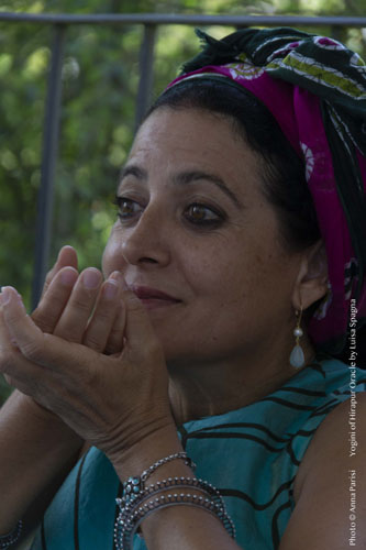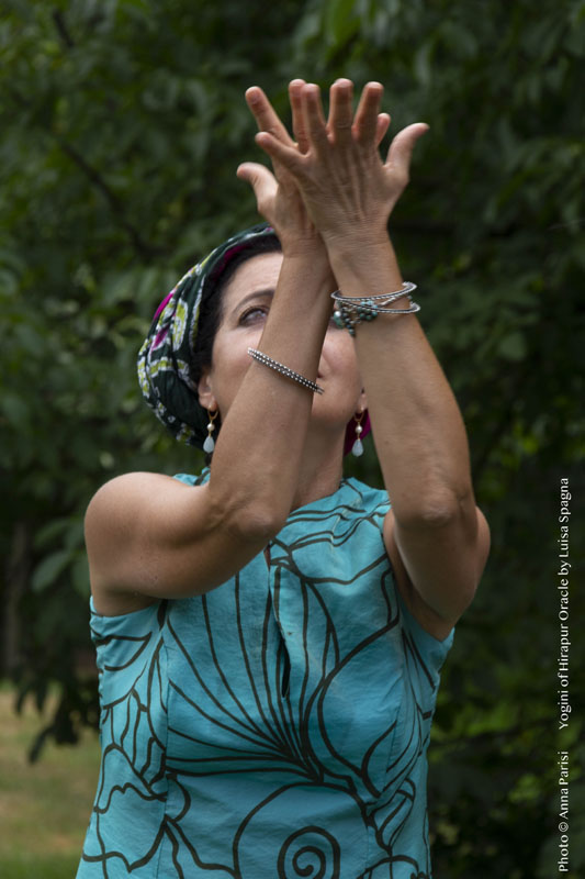 Luisa Spagna ripresa dalla macchina fotografica di Anna Parisi mentre conduce un workshop di Yogini Danze Rituali e Yogini of Hirapur Oracle a Ivrea (Giugno 2022).