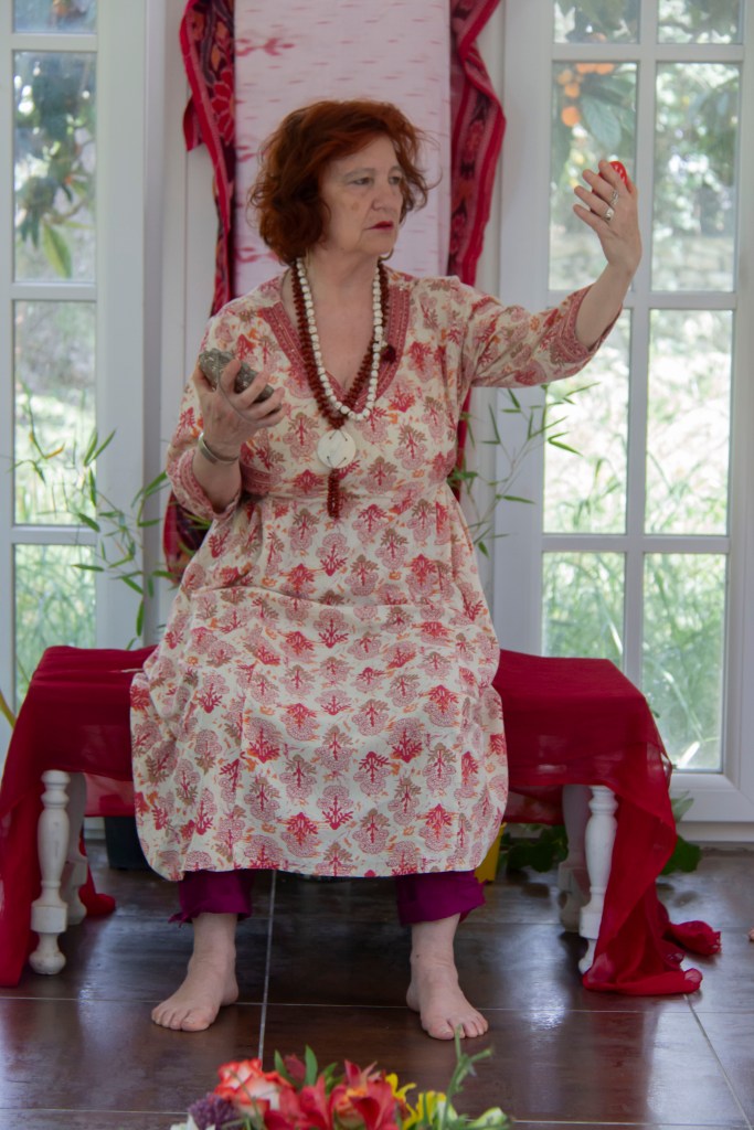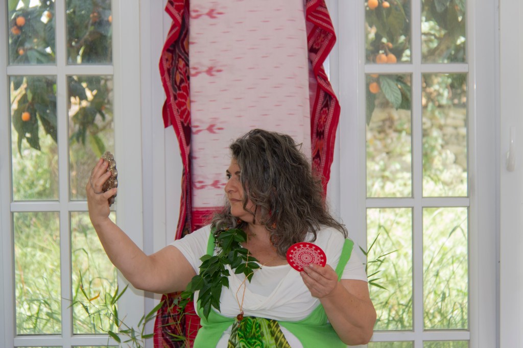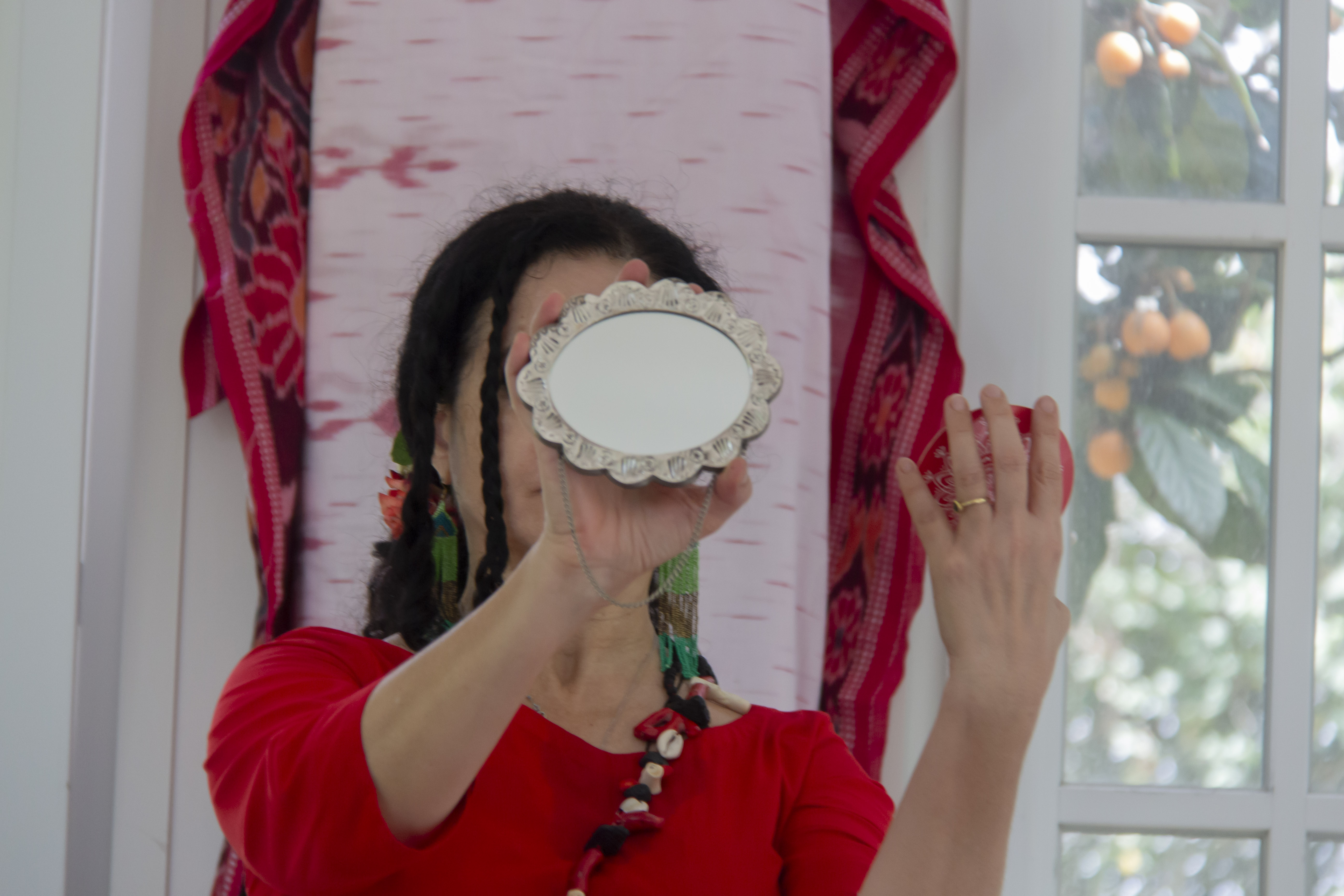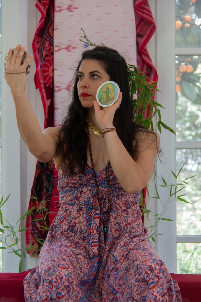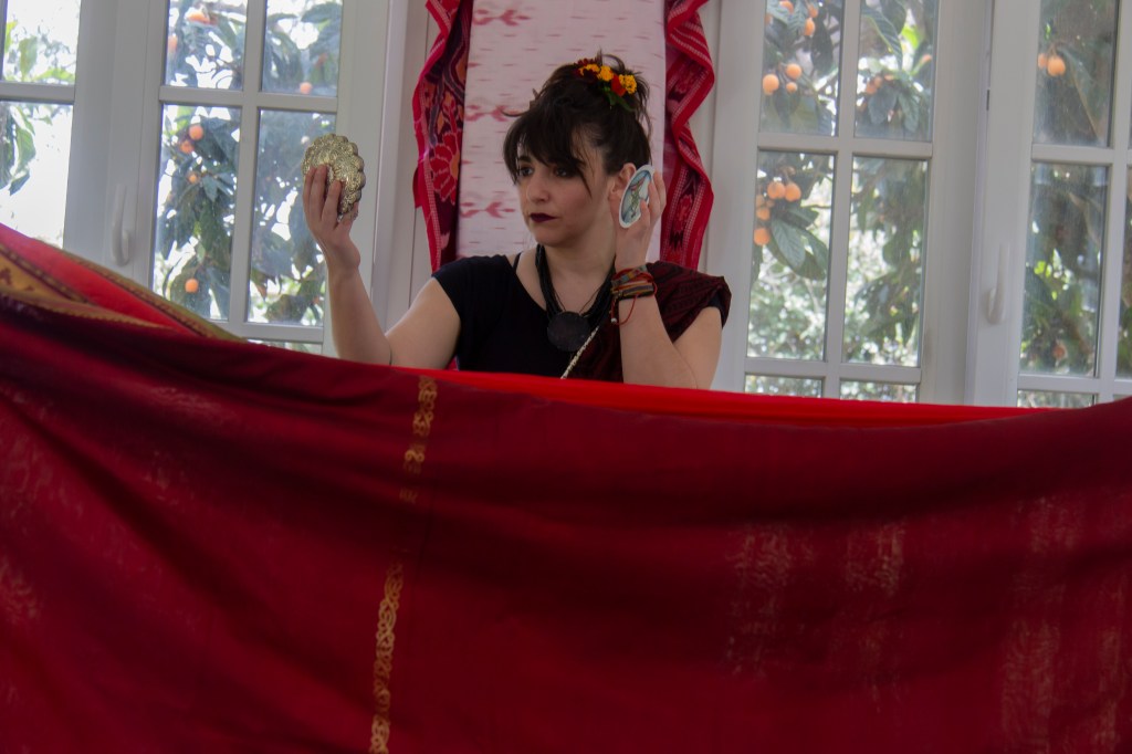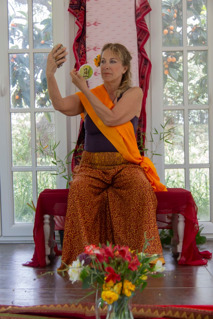 Specchiarsi e riconoscersi prima di manifestarsi all’esterno è stato un passaggio importante, iniziato con pratiche precedenti alla performance rituale oracolare finale. Ognuna delle performer-Yogini e’ stata accompagnata nel processo creativo e nella rappresentazione da due ‘aiutanti’.