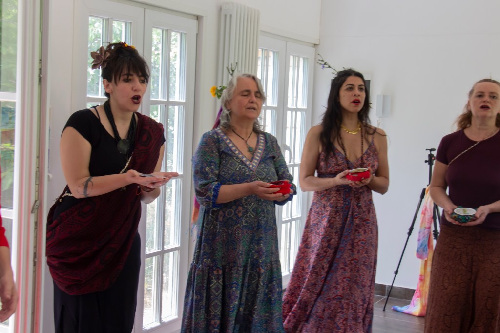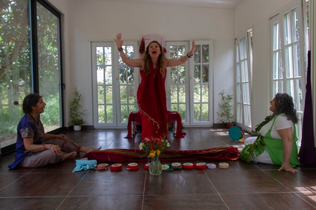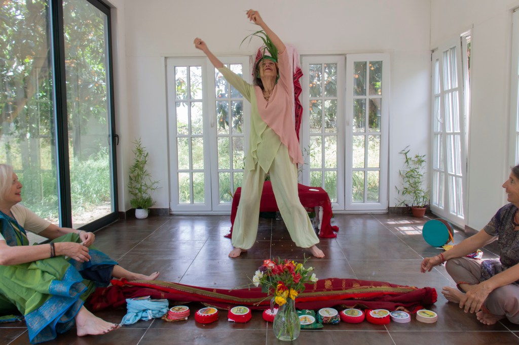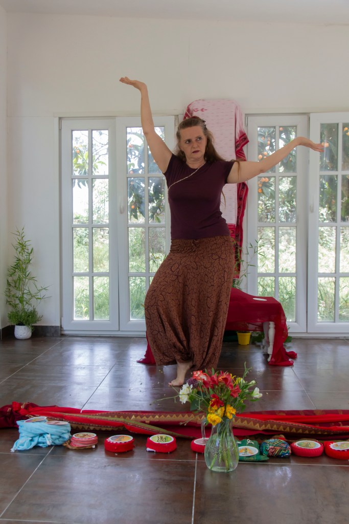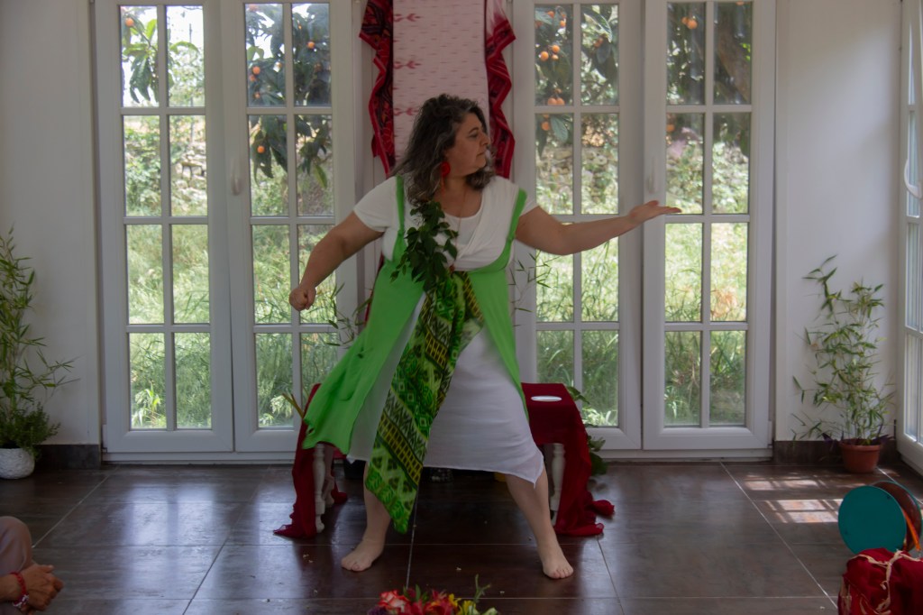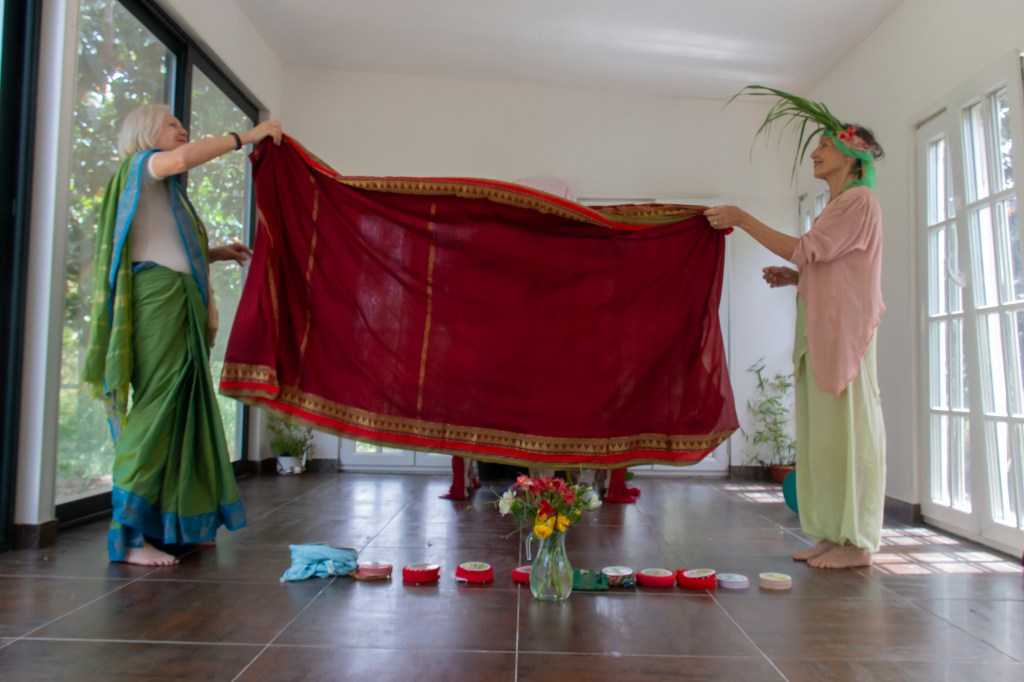Specchiarsi e riconoscersi prima di manifestarsi all’esterno è stato un passaggio importante, iniziato con pratiche precedenti alla performance rituale oracolare finale. Ognuna delle performer-Yogini e’ stata accompagnata nel processo creativo e nella rappresentazione da due ‘aiutanti’.