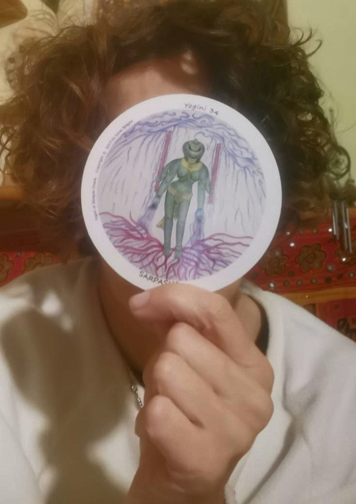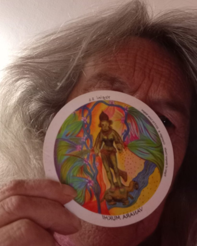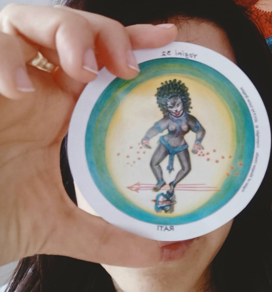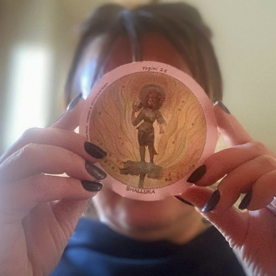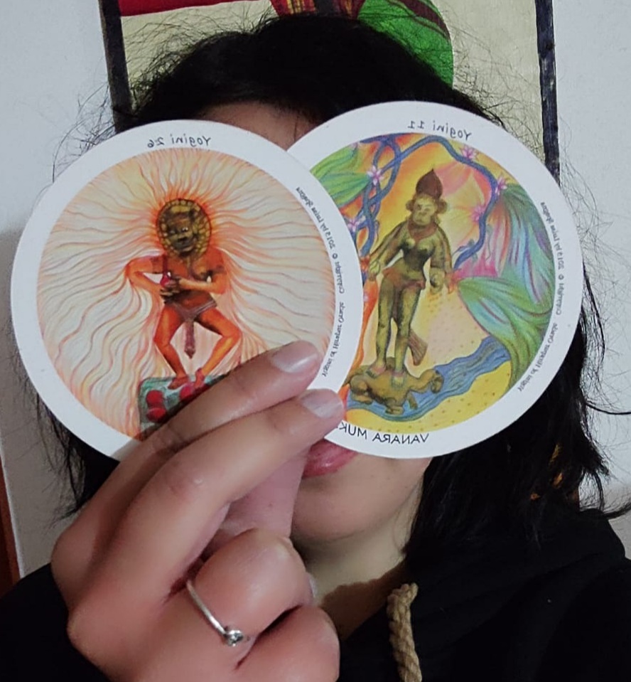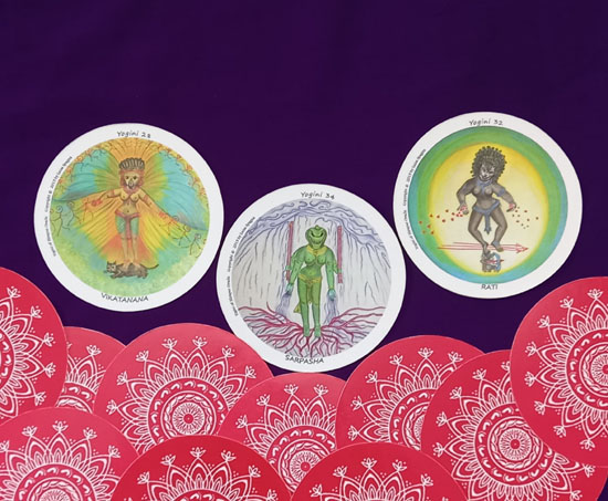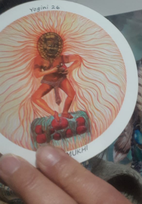 Nel mazzo di carte oracolari Yogini of Hirapur Oracle vi sono 15 Yogini Teriomorfe, dal volto di capra, cinghialessa, pesce, scimmia, orsa, serpentessa, cavalla, gatta, uccello rapace, leonessa, elefantessa.