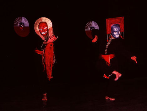 Attraverso 1+4 personaggi si rappresenta la manifestazione dell’universo. Le 4 maschere, contenute nell’unica “in principio” sono immagini degli elementi che nascono uno dagli altri, e la danzatrice che le indossa è quindi la “sostanza” prima dell’universo che si dispiega, partendo dall’etere, in quattro fasi, corrispondenti ad altrettanti stati, ovvero aereo, igneo, fluido, solido. Due sono in realtà i personaggi, l’uno immobile che governa attraverso il ritmo, è l’essenza; l’altra, danzante, è la “sostanza”. Nei termini della tradizione indù essi sono Purusha e Prakriti. Lo spazio scenico, nel quale si svolge l’intero evento dell’esistenza universale è quindi il cuore, il centro dal quale si irradia lo “spazio estremo”. Il teatro è così un simbolo di un evento interiore che accade al di fuori del tempo ed ogni istante.